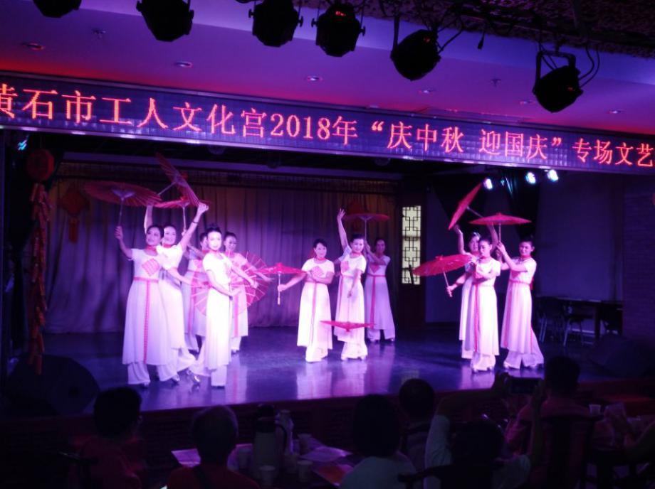 9月21日下午,黄石市工人文化宫2018”庆中秋 迎国庆”专场文艺演出在黄石工人剧场举行。市总工会党组成员、副主席梅定祥,市总工会副主席高飞,市总工会党组成员、市教育工会主席邱慧等观看了演出 。此次演出共有11个具有黄石职工特色、主题鲜明的节目参与表演,吸引近三百名职工代表、文化宫社区部分党员干部和文化宫全体干部职工观赏并获得好评。