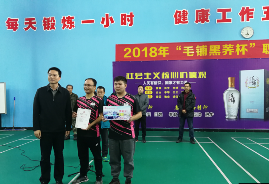11月17日至18日,为期两天的2018年”毛铺黑荞杯”职工羽毛球邀请赛在市工人文化宫羽毛球馆完赛。来自大冶有色、大冶铁矿、华电黄石热电分公司、湖北航天电缆、湖北西塞山发电等12家单位的百余名职工参赛。大冶有色、新兴管业、中石机电获得团体前三名,市总工会党组成员、副主席梅定祥,市总工会副主席高飞出席了颁奖仪式并为获奖单位颁奖。