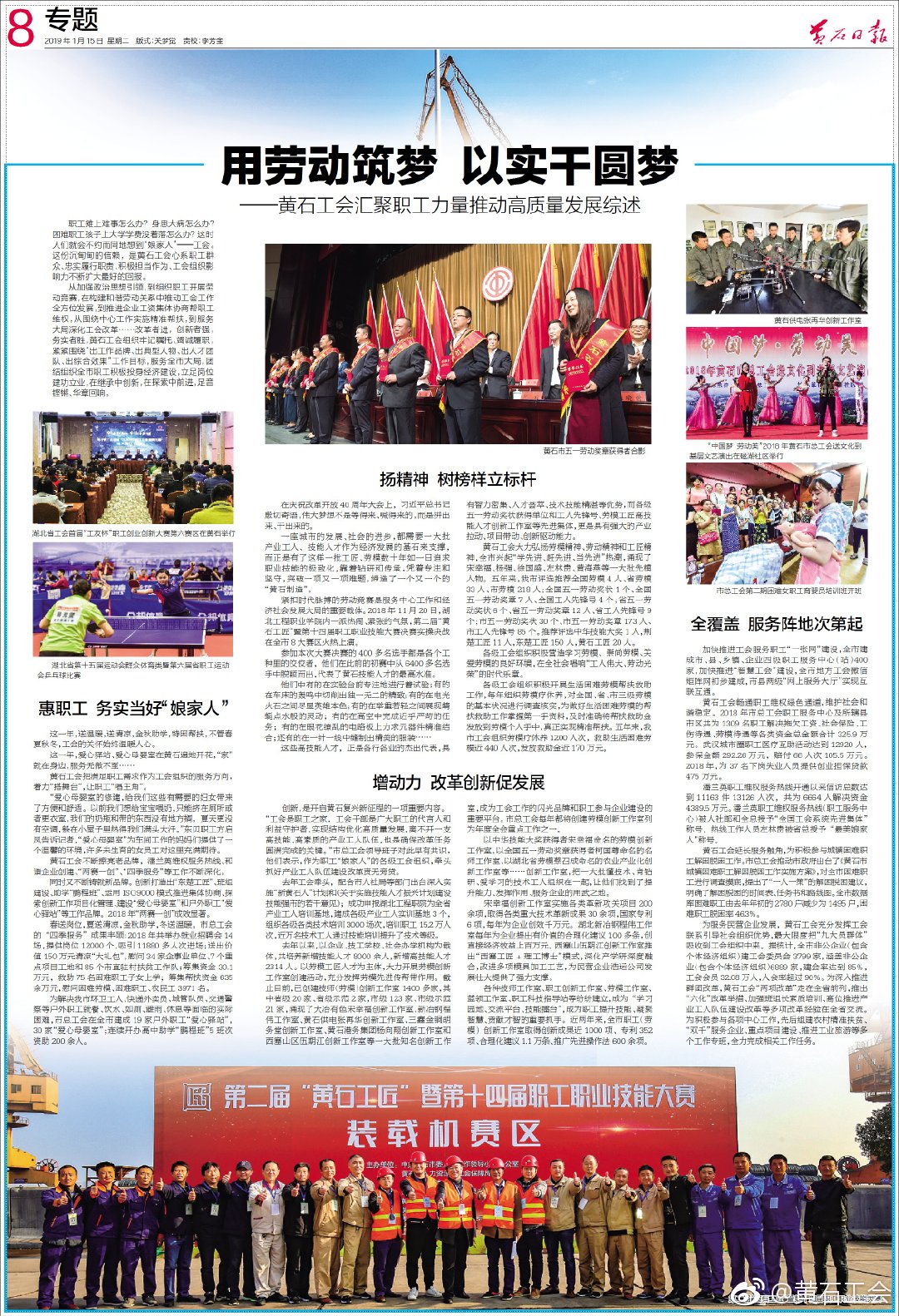 从加强政治思想引领,到组织职工开展劳动竞赛,在构建和谐劳动关系中推动工会工作全方位发展,到推进企业工资集体协商帮职工维权,从围绕中心工作实施精准帮扶,到服务大局深化工会改革……改革者进,创新者强,务实者胜,黄石工会组织牢记嘱托、竭诚履职,紧紧围绕“出工作品牌、出典型人物、出人才团队、出综合效果”工作目标,服务全市大局,团结组织全市职工积极投身经济建设,立足岗位建功立业,在继承中创新,在探索中前进,足音铿锵、华章回响。