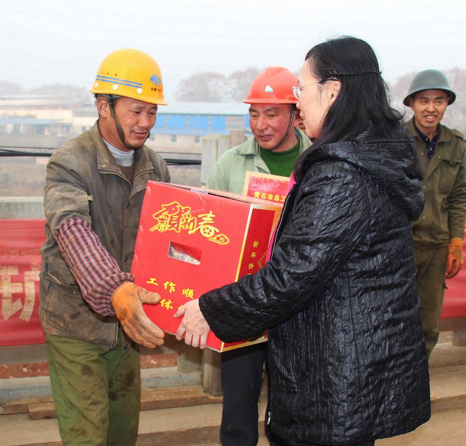 在大冶湖泵站扩建工地,钟丽萍为70名农民工送上温暖“大礼包”,嘱咐大家防寒保暖;随后到美岛公司看望3名困难职工,送去慰问物资和慰问金并鼓励他们提振信心、克服困难。