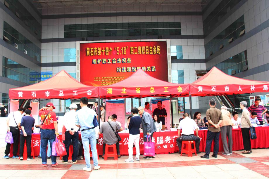 5月17日,湖北省总工会和黄石市职工维权工作协调领导小组在市工人文化宫广场开展以“维护职工合法权益,构建和谐劳动关系”为主题的维权帮扶活动,把我市第十四个“5.18职工维权日”推向高潮。市政协副主席王新华、市政府副厅级领导苏梅林、市总工会党组书记、常务副主席罗应中出席活动。