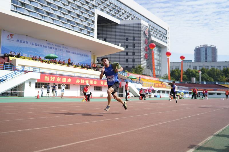 热闹非凡的黄石体育场,一场妙趣横生的赛事正精彩上演,赛场上运动员全力以赴,场下人员大声助威。本次赛事的比赛项目都简单有趣、刺激好玩。率先进行的“力士竞速”比赛,选手在起点处要背起一个重达30公斤的沙包,然后冲刺跑50米,比赛中沙包不能落地。比赛时,少数心急的选手为了求快,没有背稳沙包,反而处于落后。每当有选手不慎掉落沙包,场下都会发出遗憾的叹息声。本次比赛中,还有袋鼠跳、旋转背投等趣味项目。考验团队配合的项目也有“风雨同舟”“单腿火车”等。