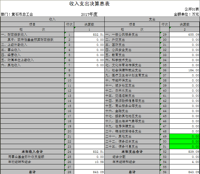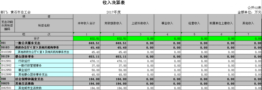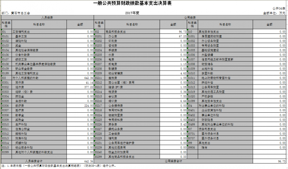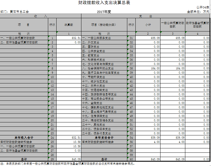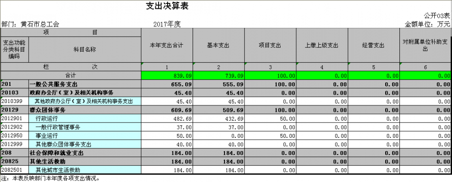 2017年部门决算反映的是黄石市总工会本级单位财政资金收支决算。财政给予市总工会的决算资金主要是财政供养的离退休人员经费、困难职工帮扶经费、省市级劳模生活困难补助经费、厂务公开、维权工作经费等。
