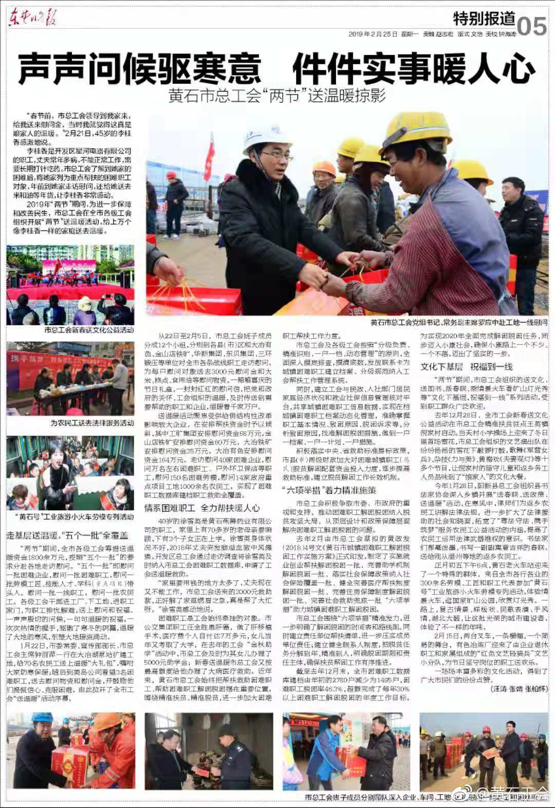 从1月22日至2月5日,市总工会班子成员分成12个小组,分别到各县(市)区和大冶有色、金山店铁矿、华新集团、东贝集团、三环锻压等单位对全市各条战线职工走访慰问,为每户慰问对象送去3000元慰问金和大米、糕点、食用油等慰问物资。一箱箱喜庆的节日礼盒,一封封红红的慰问信,把党和政府的关怀、工会组织的温暖,及时传送到需要帮助的职工和企业,温暖着千家万户。