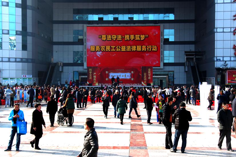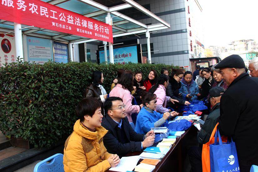 三是开展公益法律服务行动。在宪法宣传周期间,市总工会先后2次在文化宫集中开展了“尊法守法•携手筑梦”服务农民工公益法律服务行动,为农民工提供集教育、援助、咨询等于一体的综合性法律服务,共接待来访354余件1900余人次,现场回复764余人次,发放《宪法》、《工会法》、《劳动法》、《劳动合同法》等法治读本4000余册,博得市民和农民工的欢迎和好评。