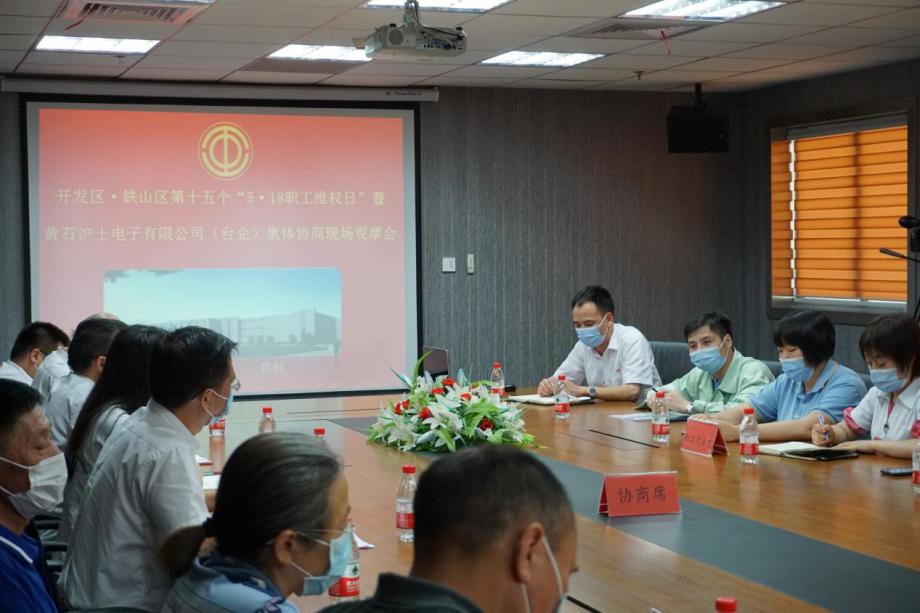 5月18日,黄石市第十五个“5·18职工维权日”之际,在黄石沪士电子有限公司会议室,公司5名职工代表与行政方5名代表正在开诚布公地就疫情防控期间、企业复工复产前后劳动用工和职工权益保障问题进行协商。协商过程中,劳动关系双方先后亮出了己方提案,通过大量数据对比和分析讲解,最后一致同意以公司《职工规章守则》为参考,对疫情防控期间和企业复工复产前后职工工资支付、休息休假、加班工资、劳动安全卫生、女职工特殊权益保护等涉及职工切身利益的内容进一步作出量化规定,并向全体职工公布。这是开发区·铁山区总工会制发《关于应对疫情影响切实做好集体协商工作的指导意见》后,辖区第一家规模最大、职工人数最多的台资电子企业首次开展集体协商。市总工会党组成员、经审委主任刘春燕,权益保障部副部长麻志斌,工资集体协商指导员张绪怀,区总工会副主席张秀敏,集体协商指导员、法律顾问及辖区台资企业行政负责人和工会主席见证了协商会议的全过程。