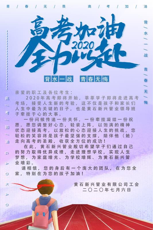 十年磨剑三日锋,数载人生在其中,经过十数载的寒窗苦读,学子们终于迎来了收获的季节。这不仅牵动着家长的心,也牵动着黄石新兴管业工会"娘家人"的心。临近高考,公司工会一如既往地为今年参加高考的学生和坚守在工作岗位的家长职工们寄出了高考慰问信,送去了关怀和祝福。
