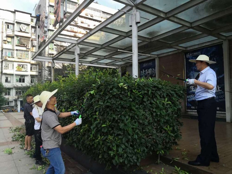 时值盛夏,文化宫广场热浪袭人,头戴草帽、手拿剪刀的一群人正在绿化带旁“咔嚓咔嚓”地剪枝……