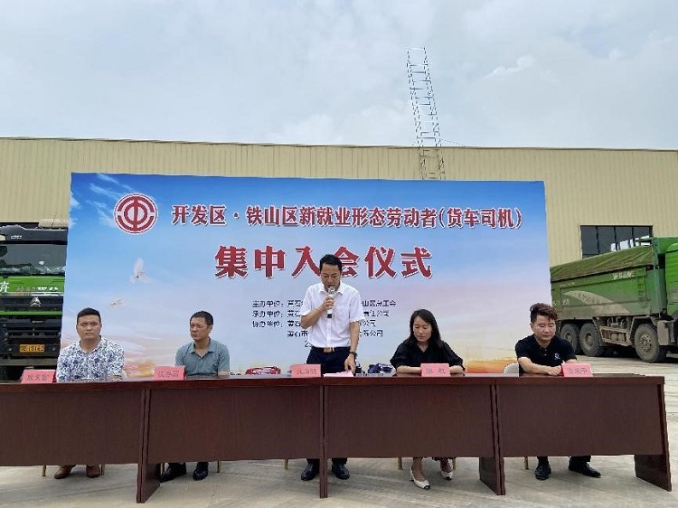 6月20日上午,开发区·铁山区新就业形态劳动者(货车司机)集中入会仪式在黄石市卉垚渣土运输有限责任公司里举行,现场来自3家企业的100名货车司机参加入会仪式。