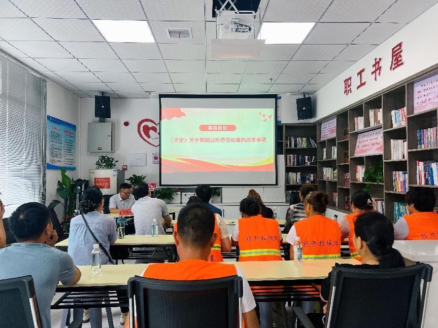 为深入学习宣传贯彻党的二十届三中全会精神,8月16日,开发区·铁山区总工会副主席李伍连在开发区·铁山区总工会在百花路职工服务中心工会驿站为20多名新就业形态劳动者开展党的二十届三中全会精神宣讲活动。