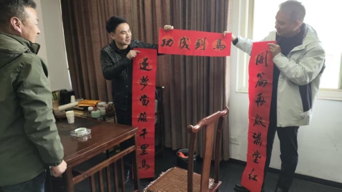 走访现场,领导班子一行带着精心准备的楹联,逐一走进各租户经营场地,结合不同业态特点送上专属祝福。在湖北金汇酒店有限公司,楹联“逐梦当为千里马 开篇再起满堂红”贴合酒店经营属性,传递出对企业提质增效的期许;为弘康中医医院送上“服务进行时欣感春风一扬 安心疗养处静观明月满窗”,彰显对医护工作者的敬意与祝福;给小城故事送上“足享健康迎新春 马奋蹄急展宏图”,寄语商户深耕经营、再创佳绩。红底墨香的楹联不仅承载着新春祝福,更拉近了工会与租户之间的距离,让商户在寒冬中感受到浓浓的暖意。